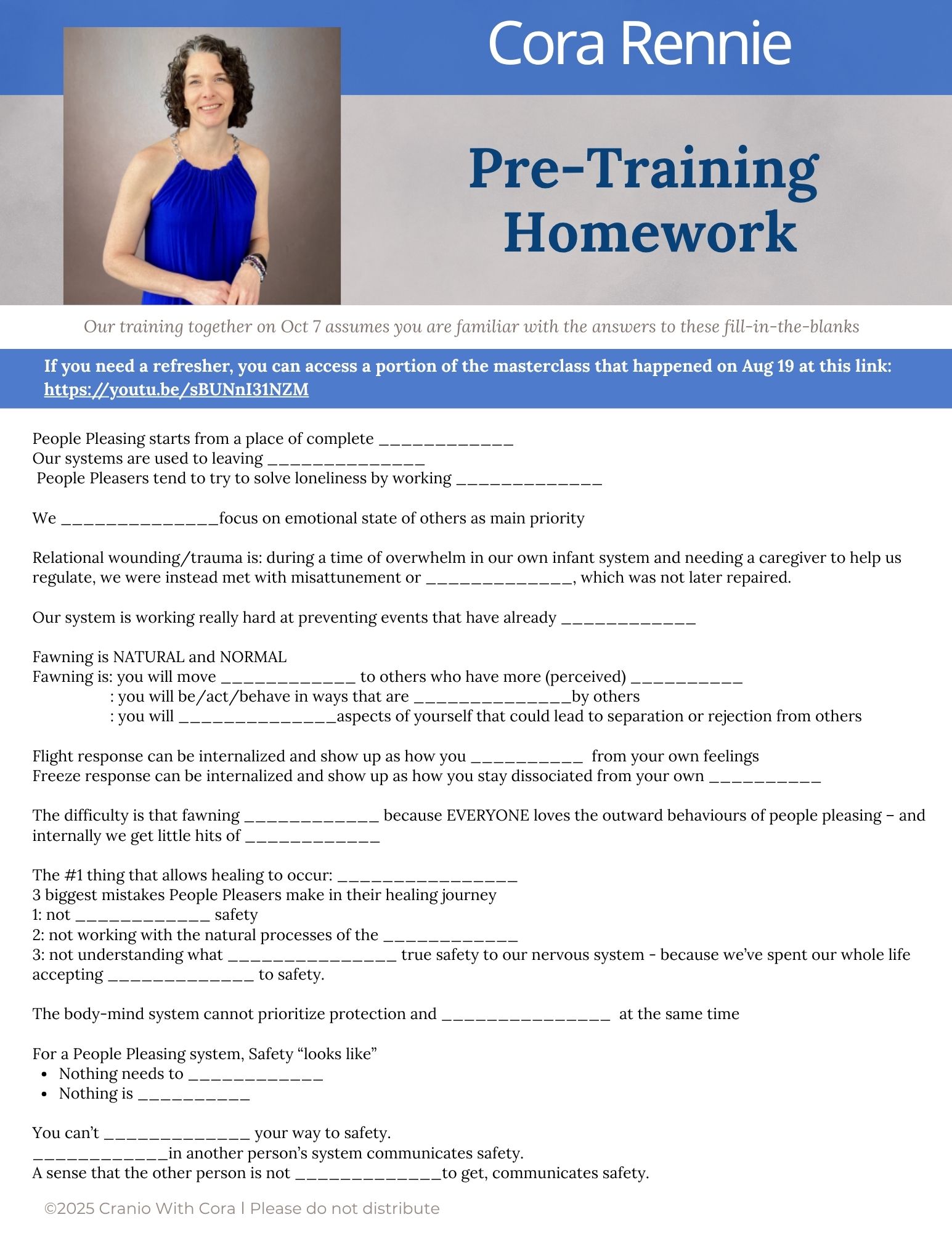 1. This training assumes you know a bit about the origins of People Pleasing and the Fawning response. For a refresher please watchthis videoand complete this short fill-in-the-blank document